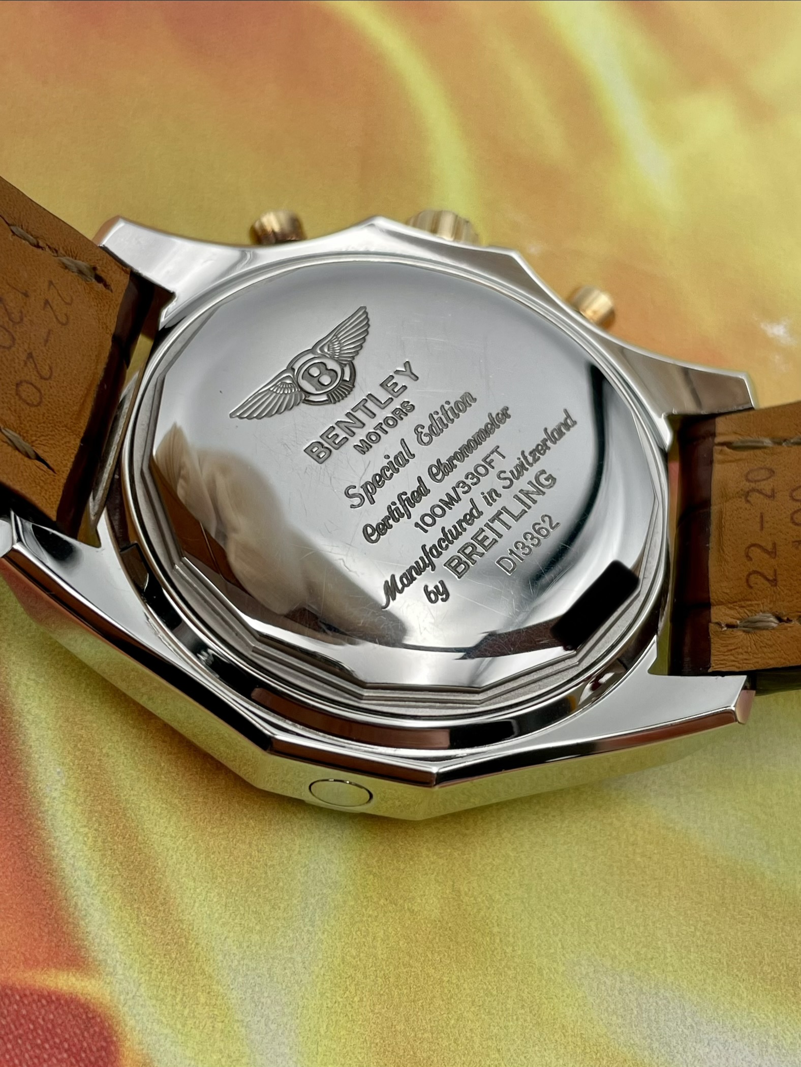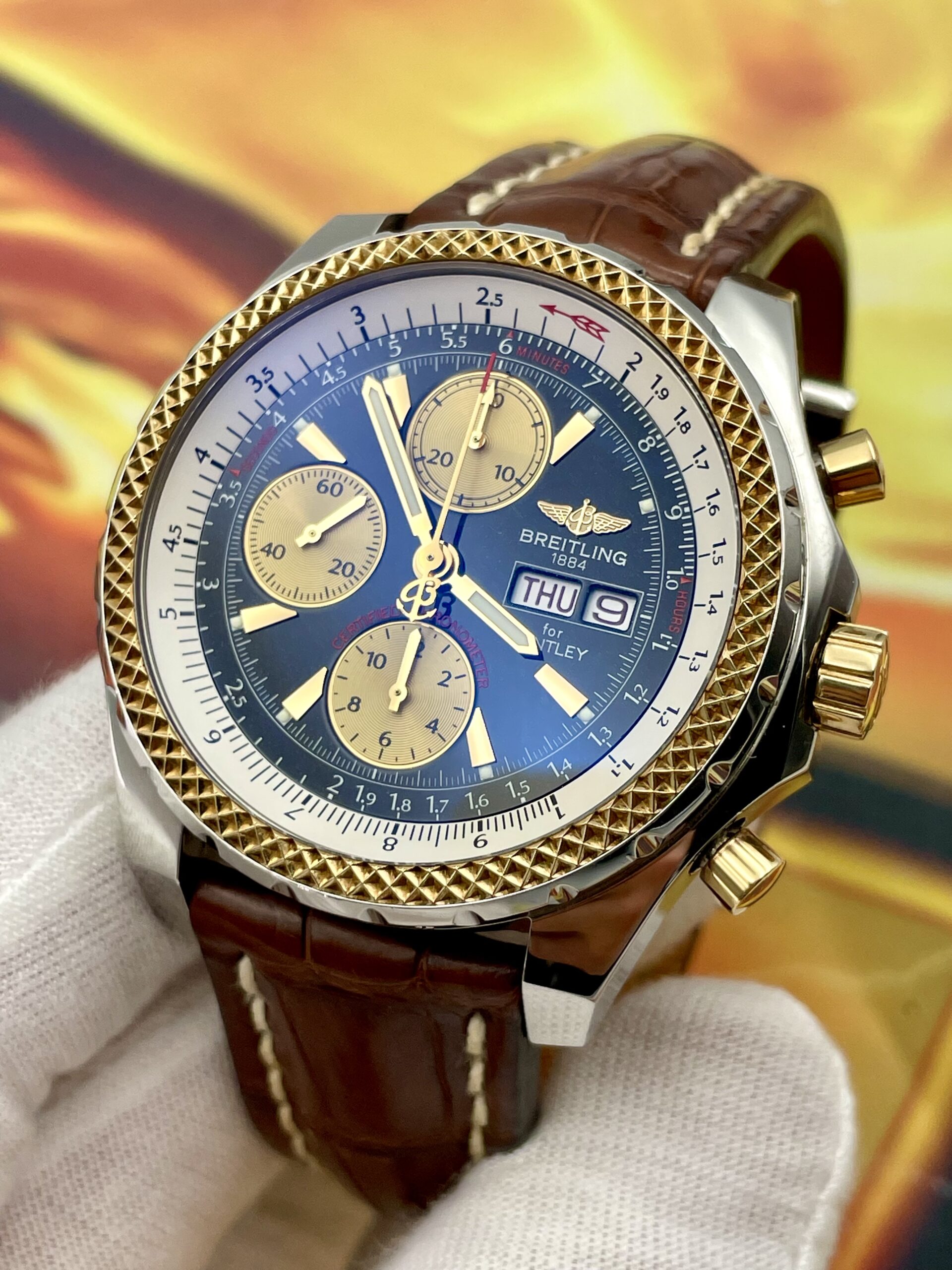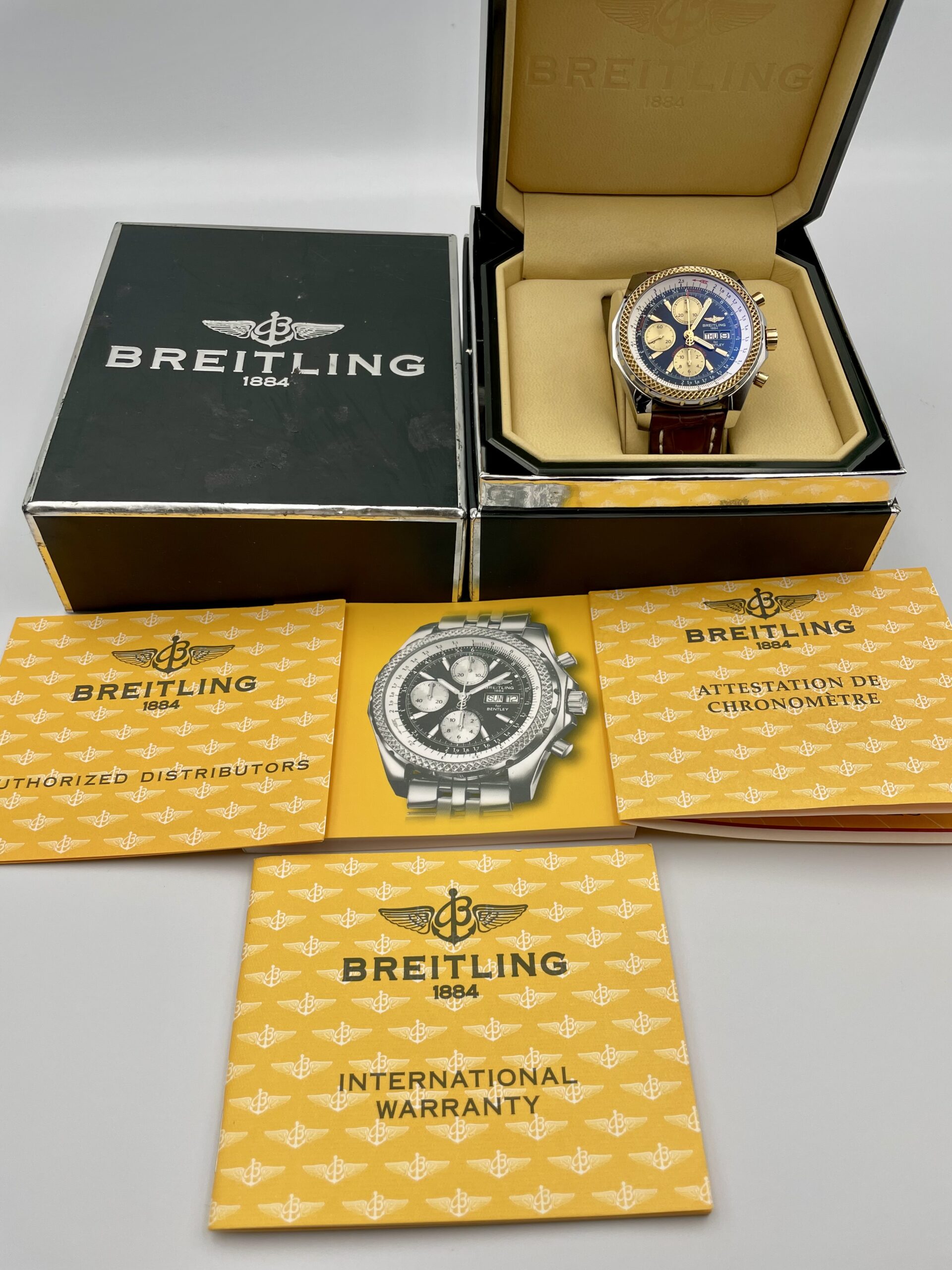 Presented for sale is this striking Breitling for Bentley GT Ref. D13362, a bold and luxurious chronograph created as part of Breitling’s celebrated partnership with Bentley Motors. This 2005 example combines distinctive design with substantial wrist presence and is offered complete with its original box and papers.