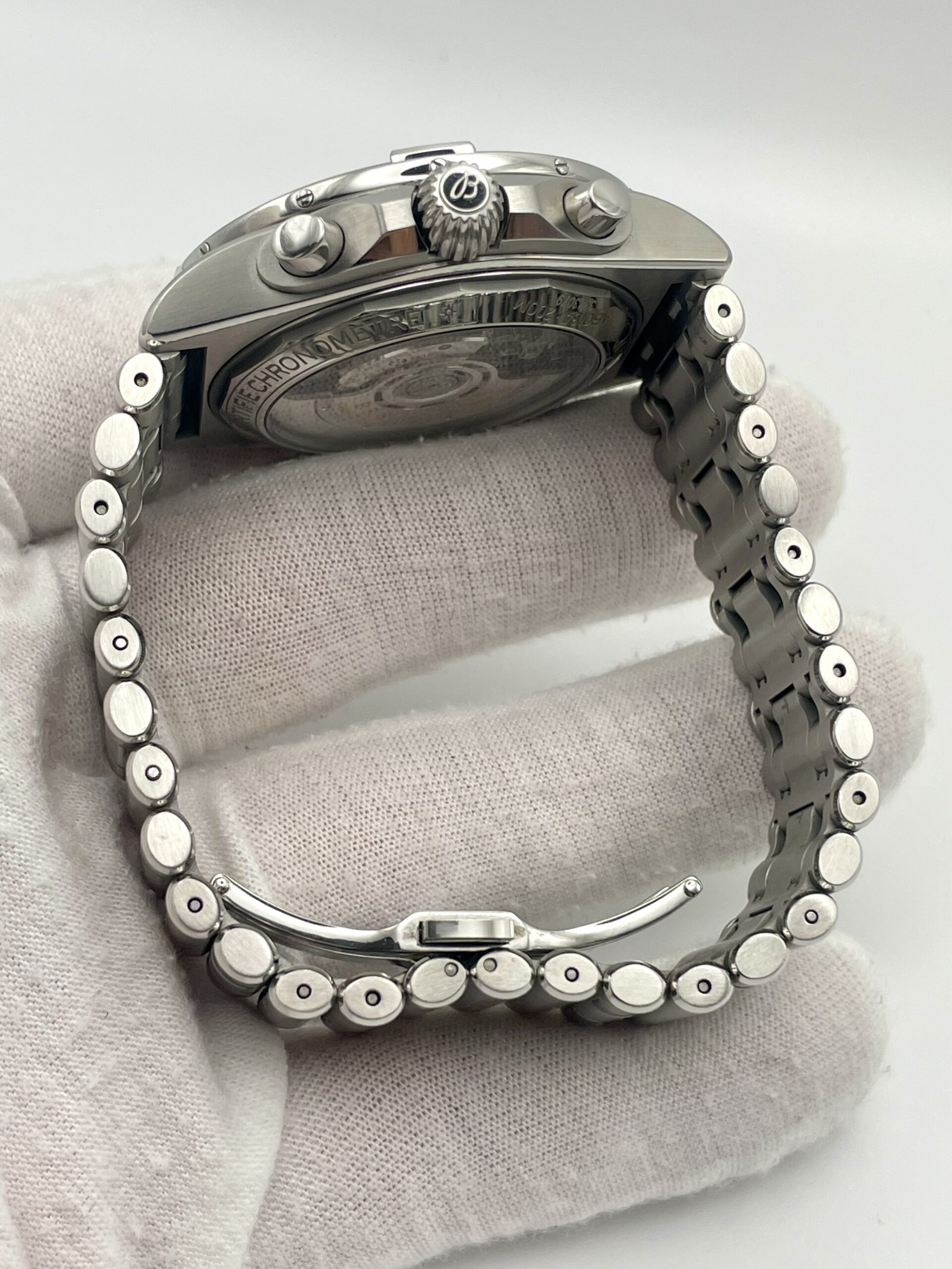 The watch features a stainless steel 42mm case with the signature rider-tab bezel, paired with a sleek black dial and contrasting silver chronograph subdials.