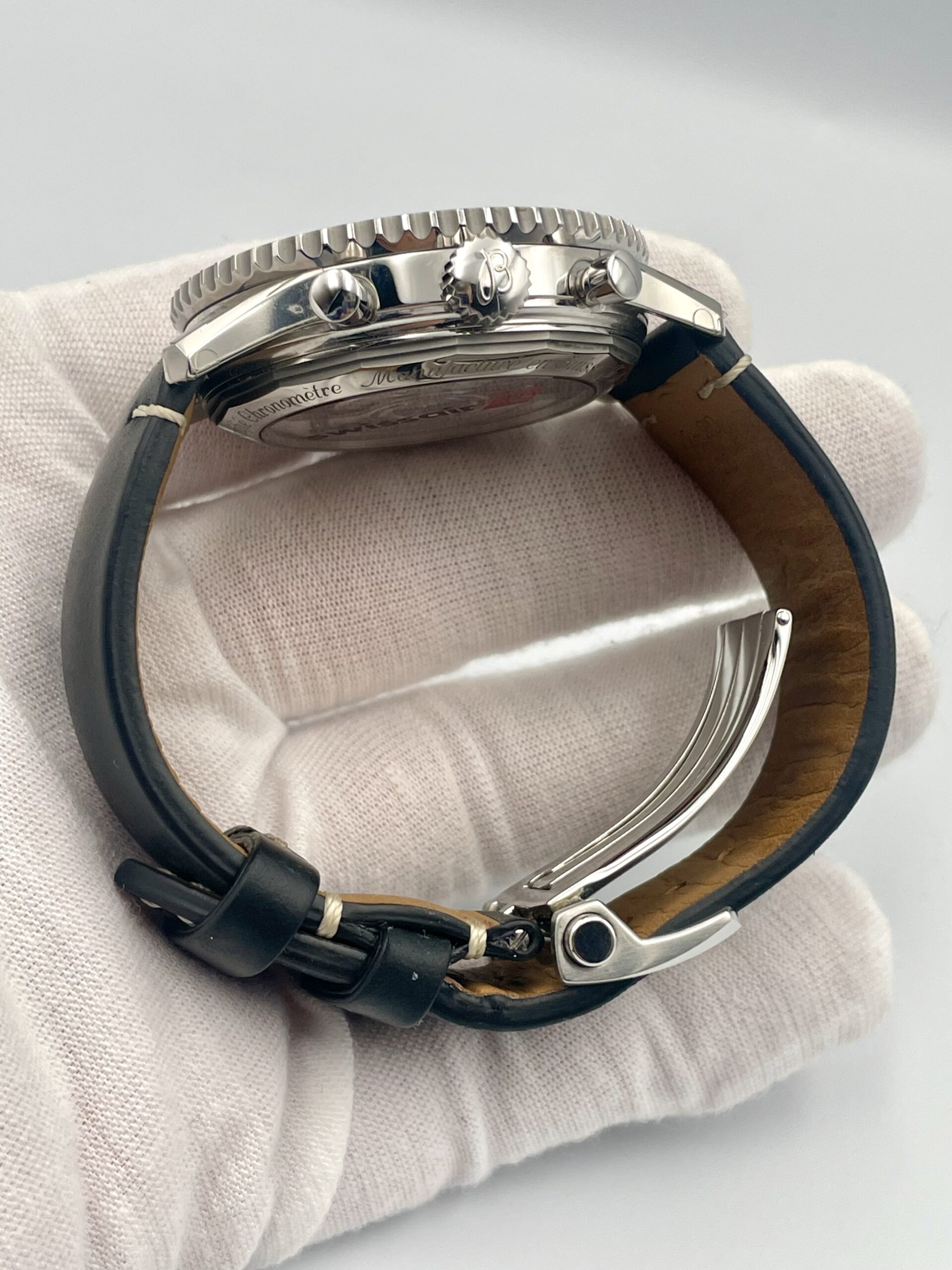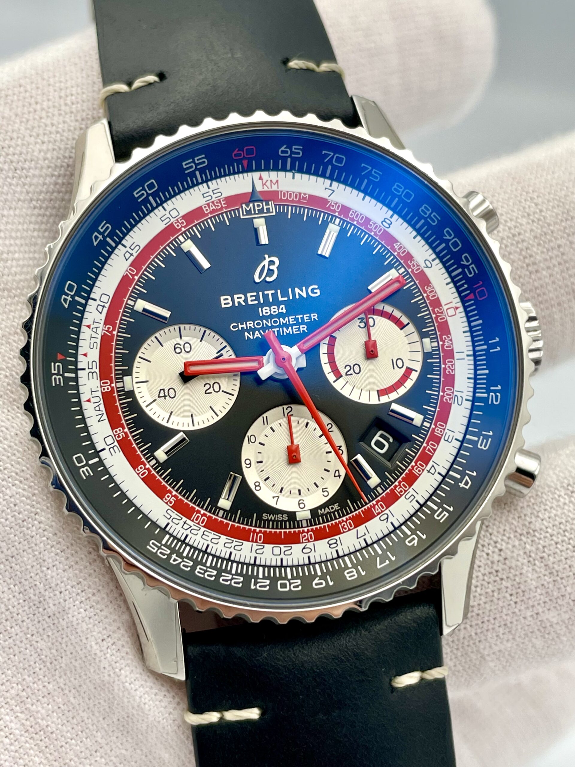 The watch features a 43mm stainless steel case paired with a black dial, contrasting silver subdials, and the classic circular slide rule that defines the Navitimer collection. Powering the watch is Breitling’s in-house Calibre B01 automatic chronograph movement, offering a 70-hour power reserve and COSC-certified precision.