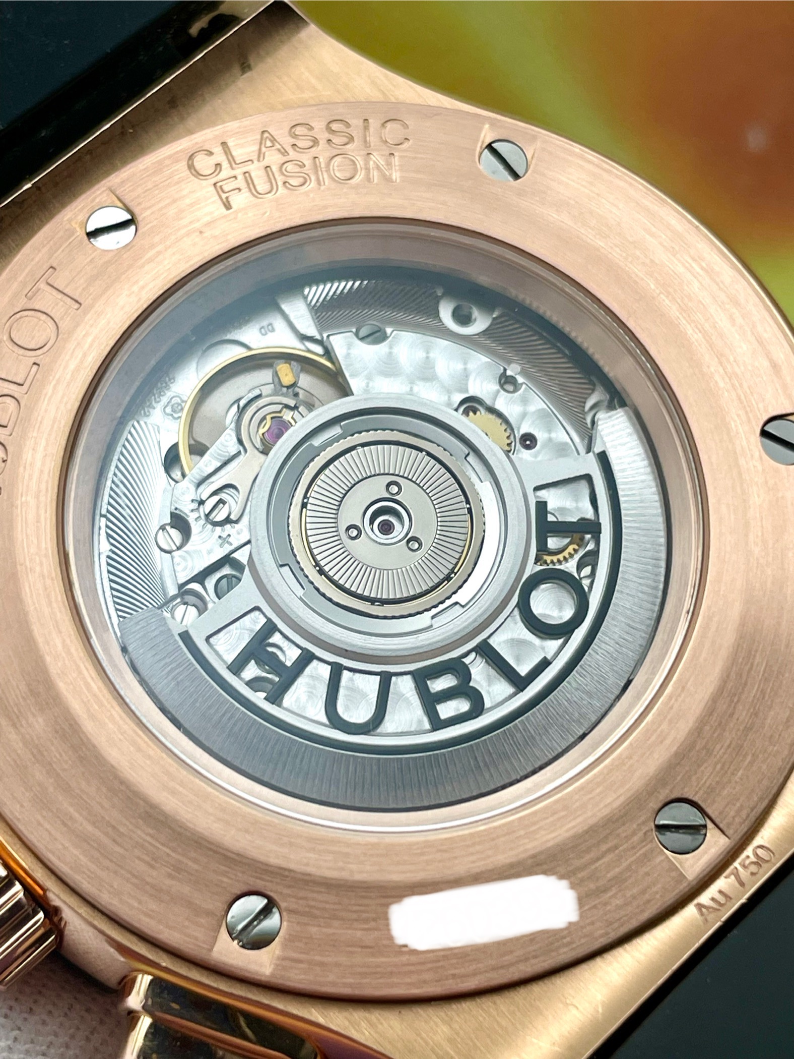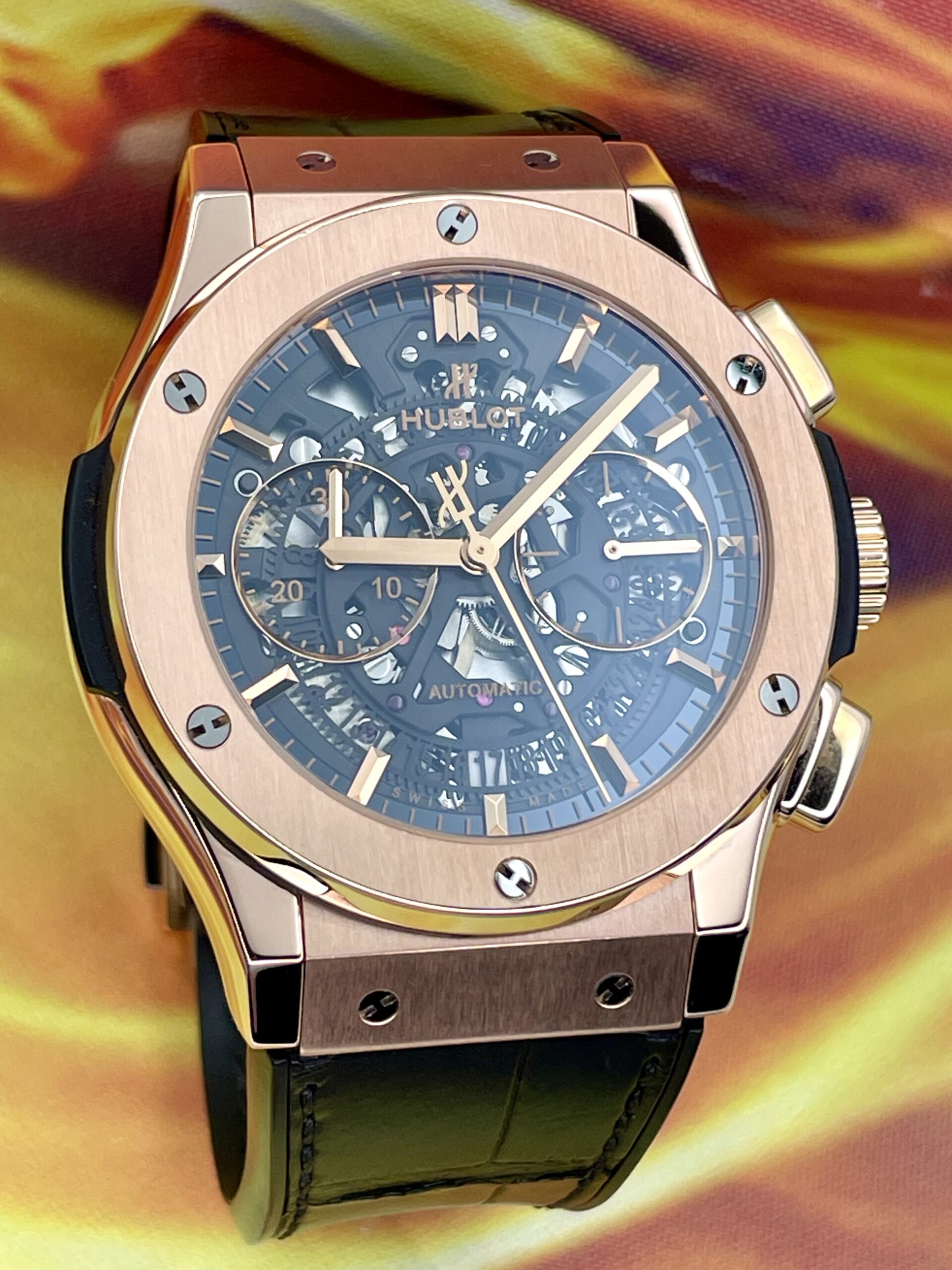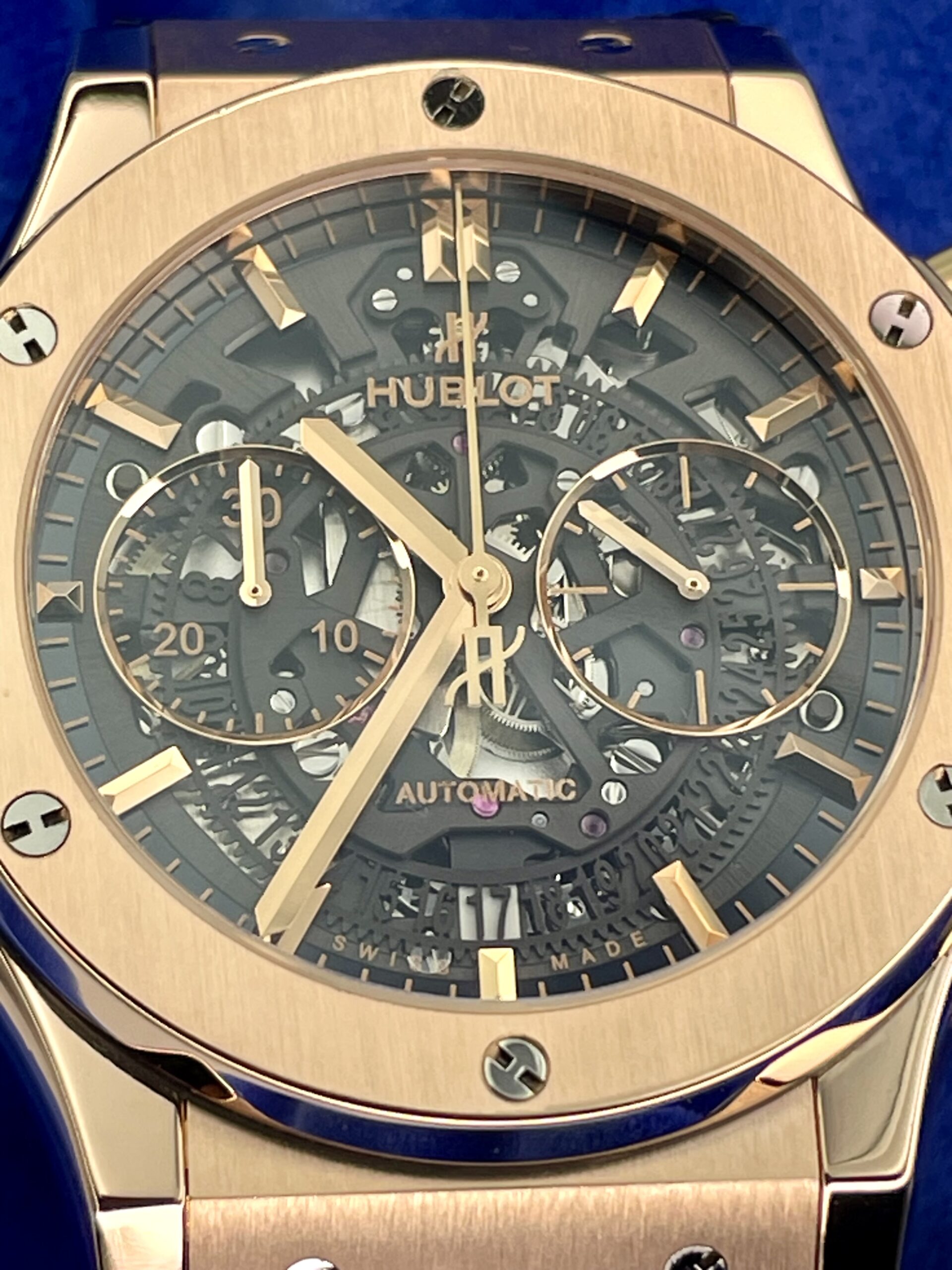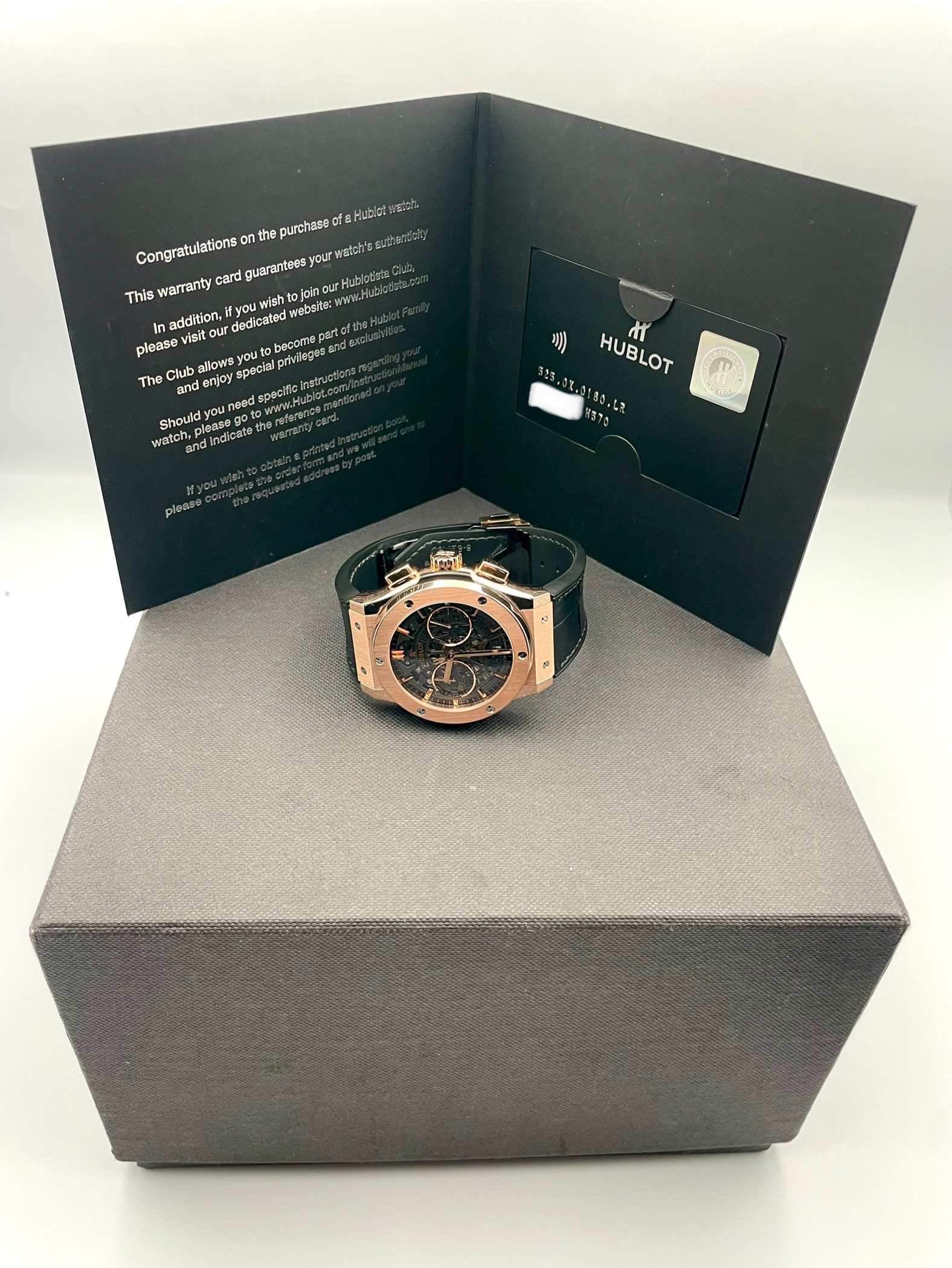 The watch features a beautifully finished 45mm King Gold case — Hublot’s exclusive alloy that offers a warmer, richer tone than traditional rose gold. The skeletonised Aerofusion dial provides a captivating view of the chronograph movement, with applied indices and contrasting details that give the watch depth and a strong modern presence.