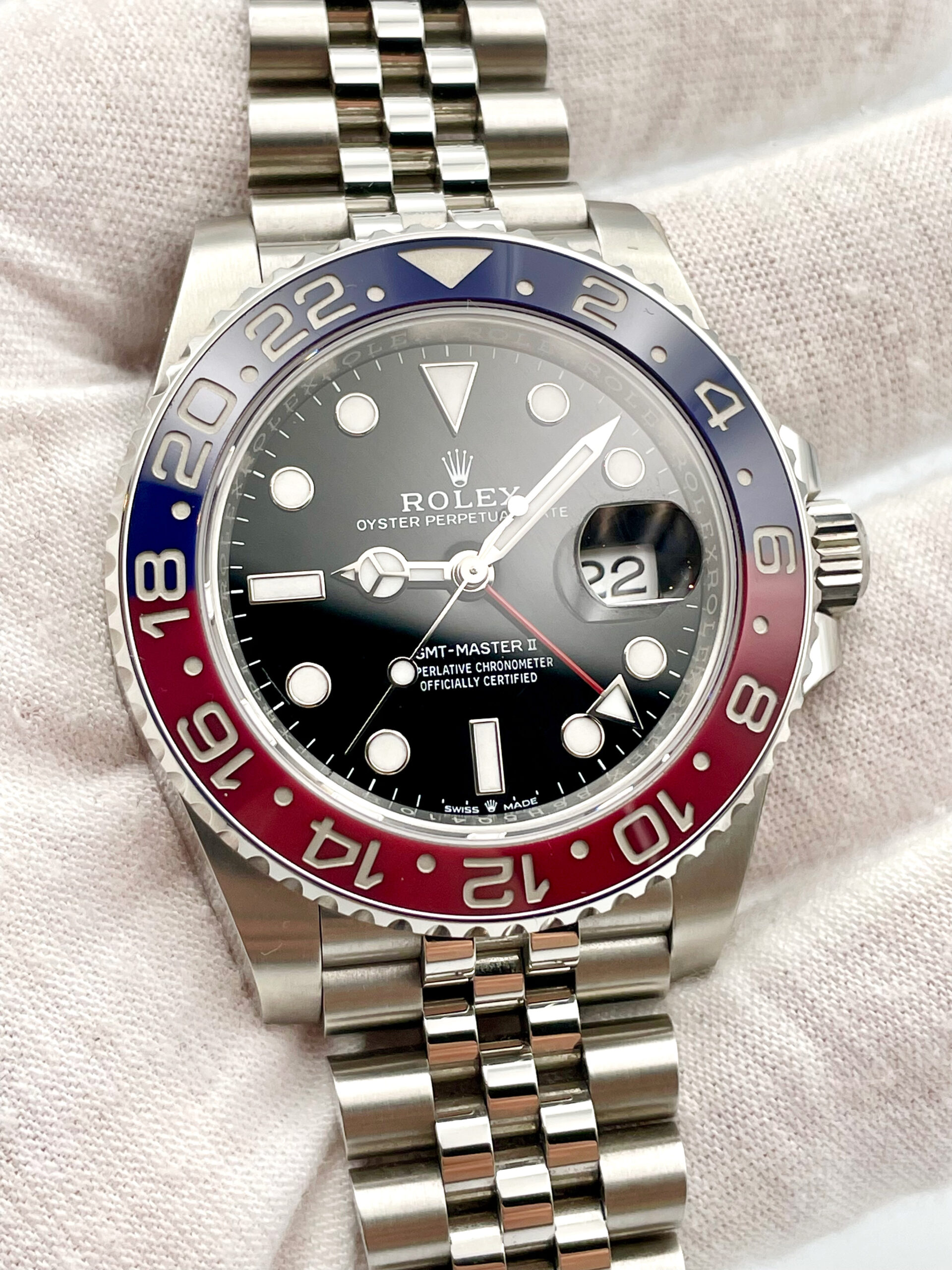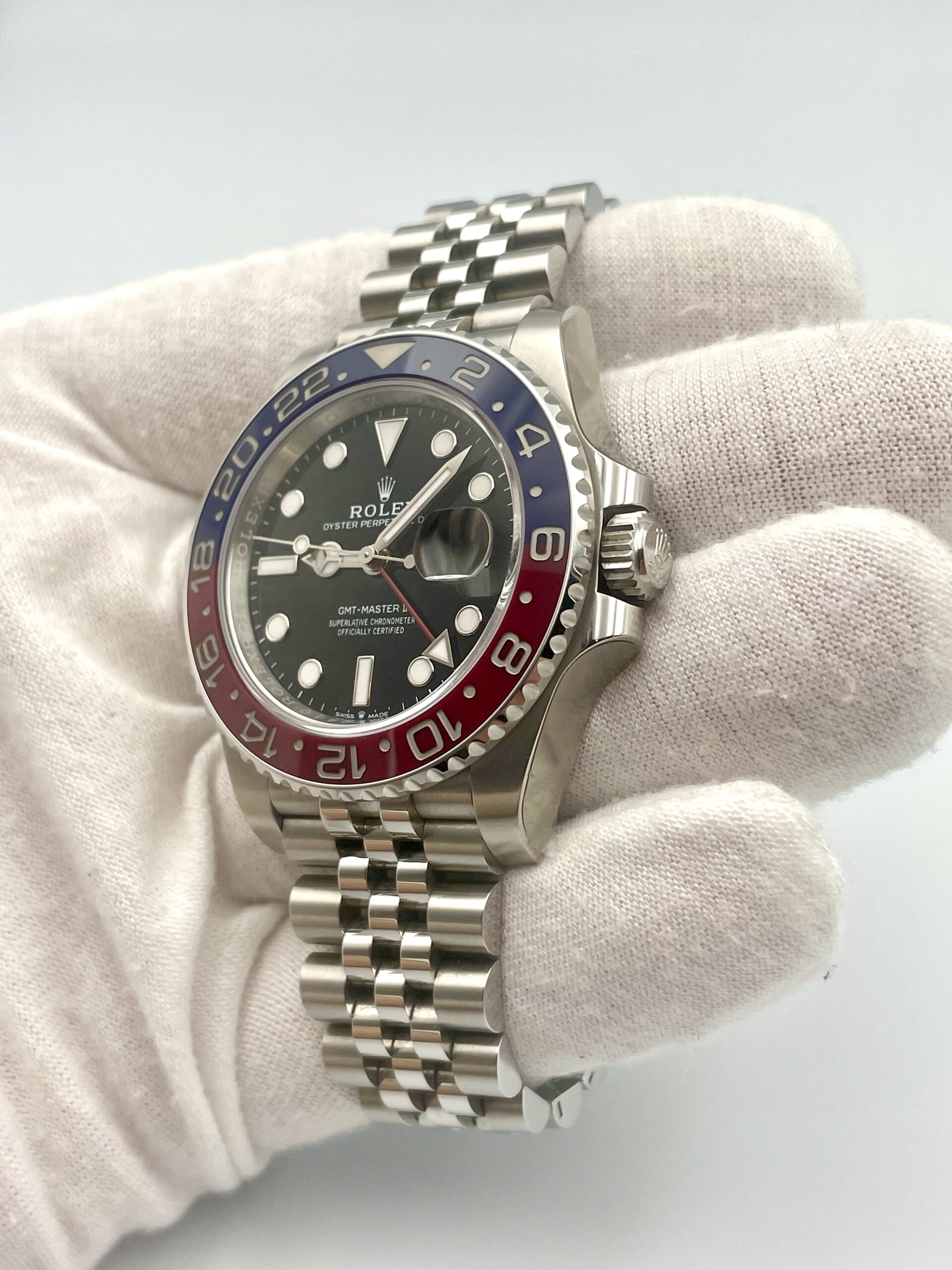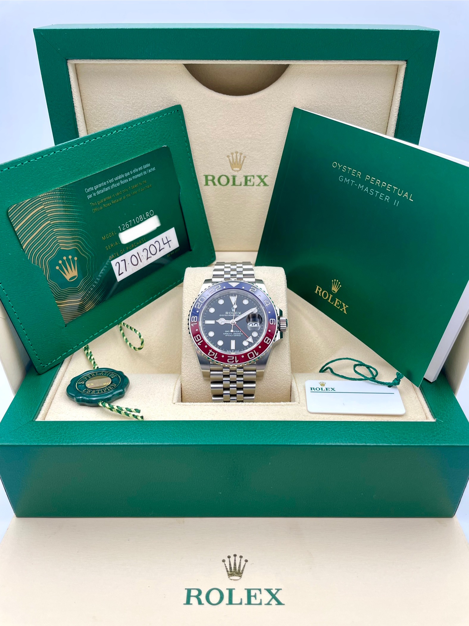 The Rolex GMT-Master II ref. 126710BLRO — often called the “Pepsi” — is one of Rolex’s most iconic and sought-after modern sports watches. It combines the legendary GMT function with the red-and-blue bezel that has been synonymous with Rolex travel watches since the 1950s. The comes as full set and mint condition.